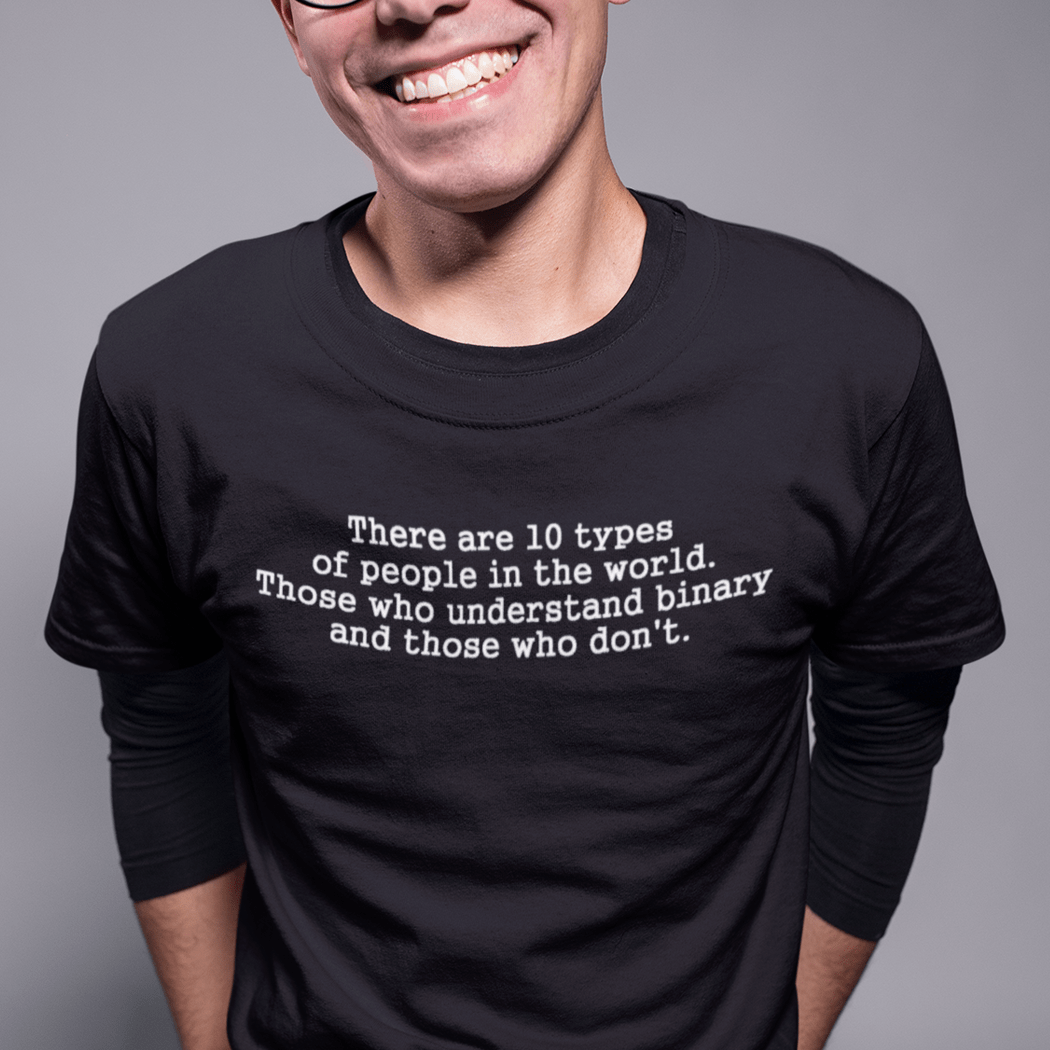 Those who understand binary, and those who don't. If you got that joke immediately, this is the t-shirt for you. Our Understanding Binary slogan t-shirt is the perfect funny gift for geeks, programmers and tech enthusiasts who appreciate humour that requires a little extra processing power. Looking for a novelty geek t-shirt or a tech gift idea that only the right people will get? You've found it.